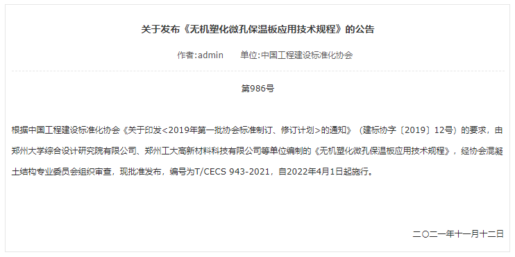 由鄭州大學(xué)綜合設(shè)計(jì)研究院有限公司、我司主編,中國建筑科學(xué)研究院有限公司等十七家單位參編的《無機(jī)塑化微孔保溫板應(yīng)用技術(shù)規(guī)程》(以下簡稱:《規(guī)程》)近日發(fā)布,自2022年4月1日起施行。